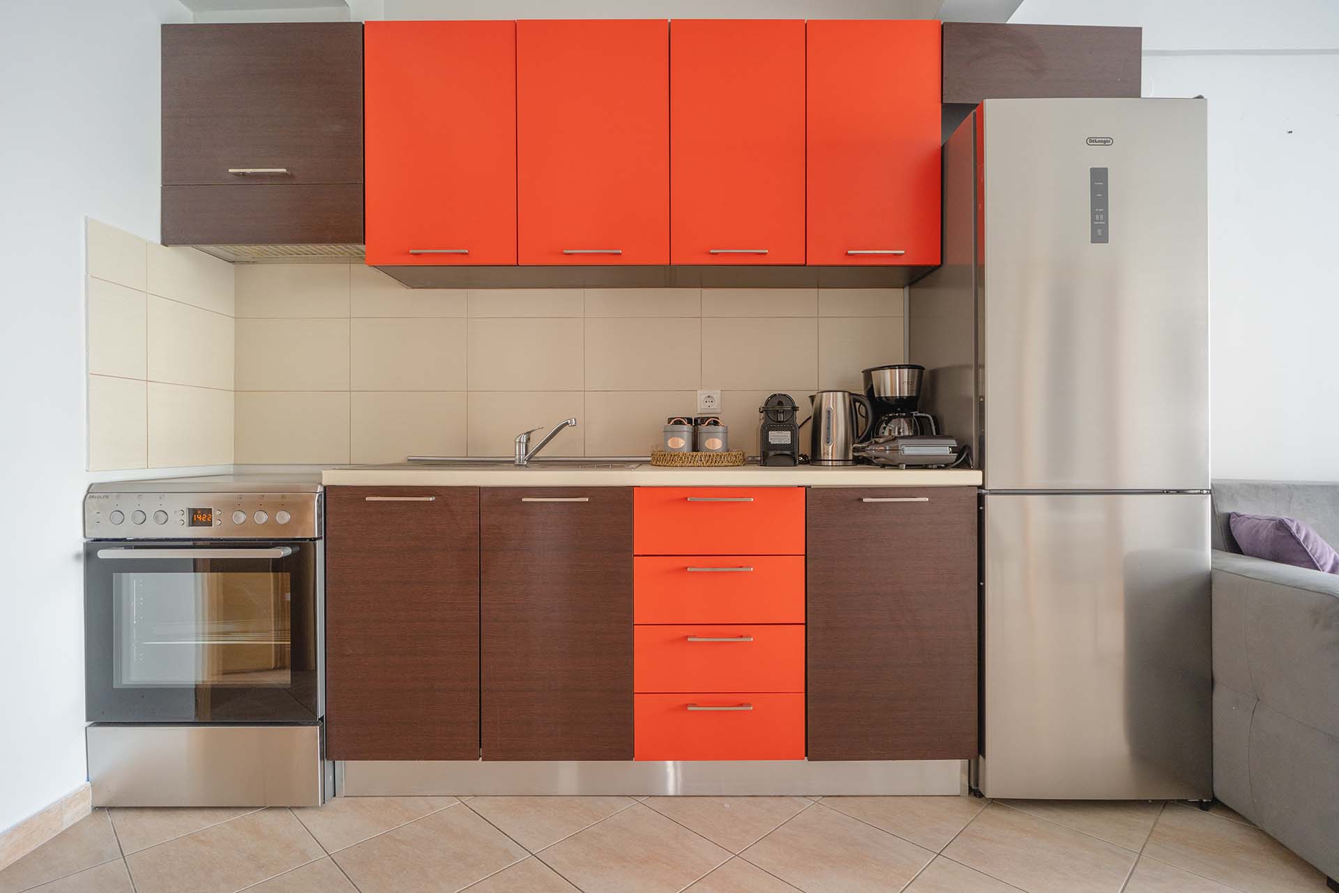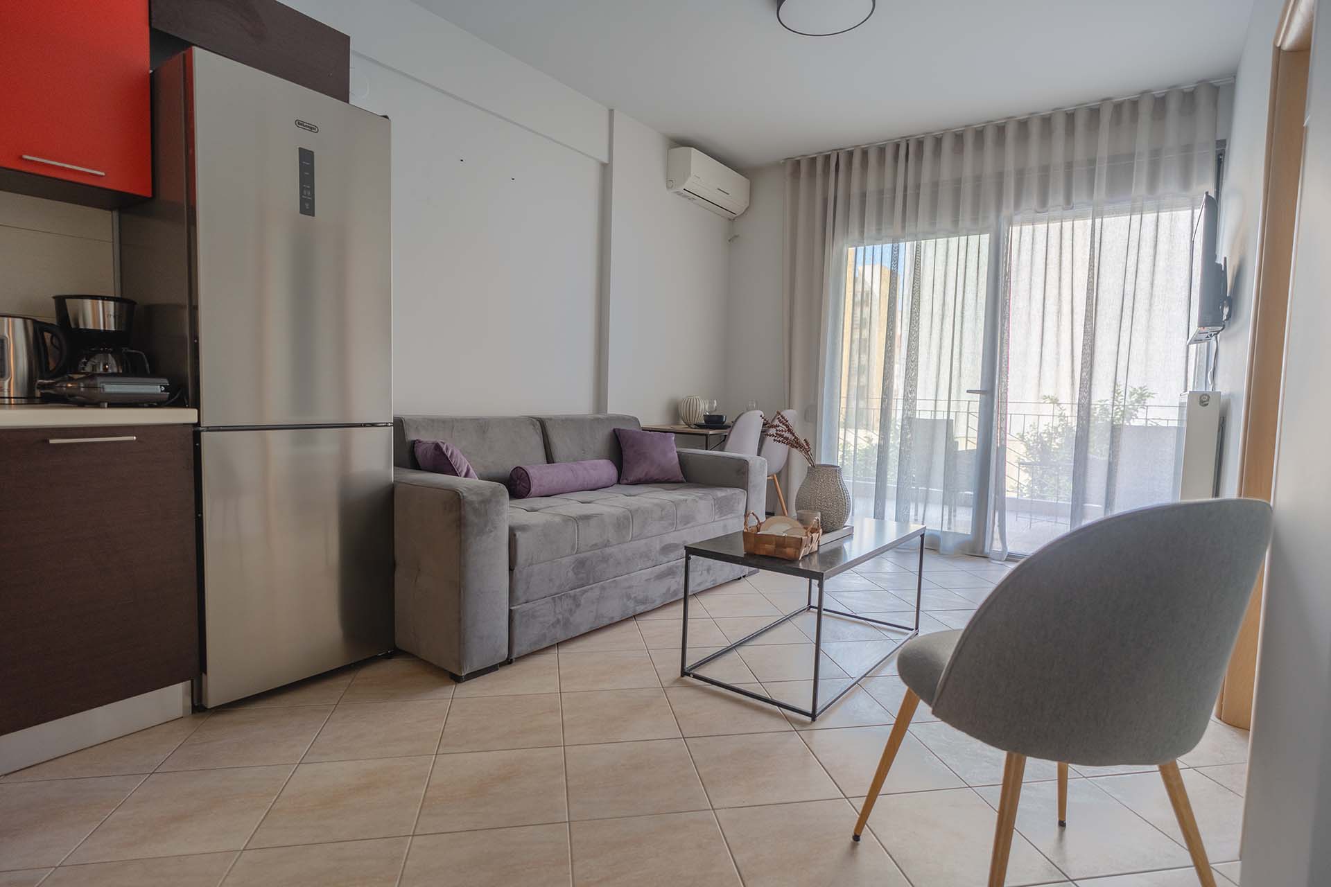The single main space is contemporary decorated. It includes a table-office for professional use, storage areas, a living room with a comfortable sofa that turns into a double bed, SmartTV and satellite, Wi-Fi. The kitchen is fully equipped with all necessary tableware (such as coffee maker, nespresso machine, kettle, toaster) and cooking utensils, as well as a large fridge, electric oven and ceramic hob.